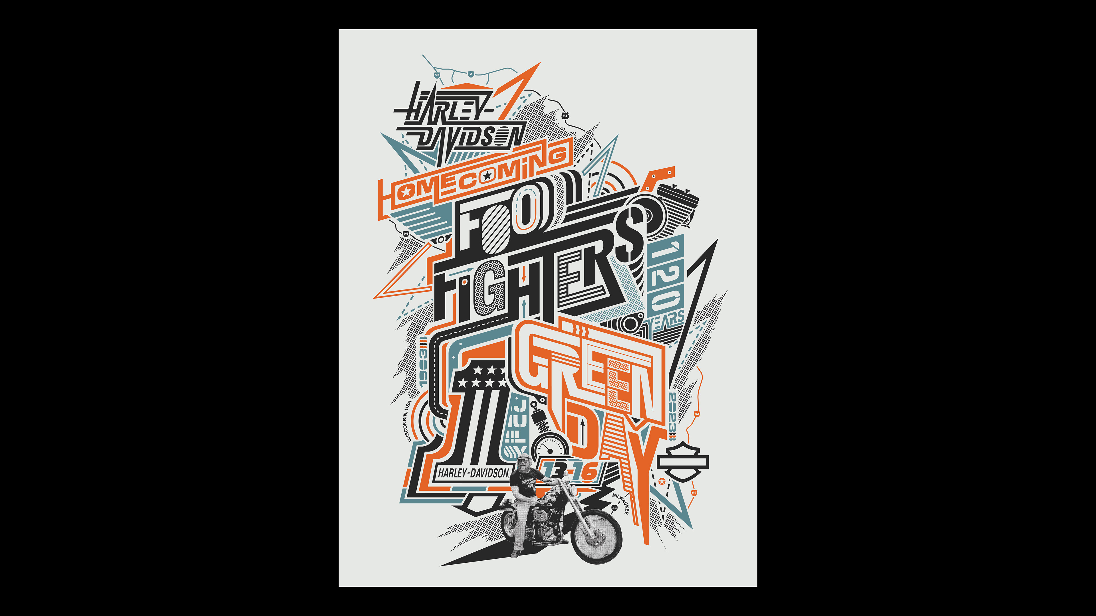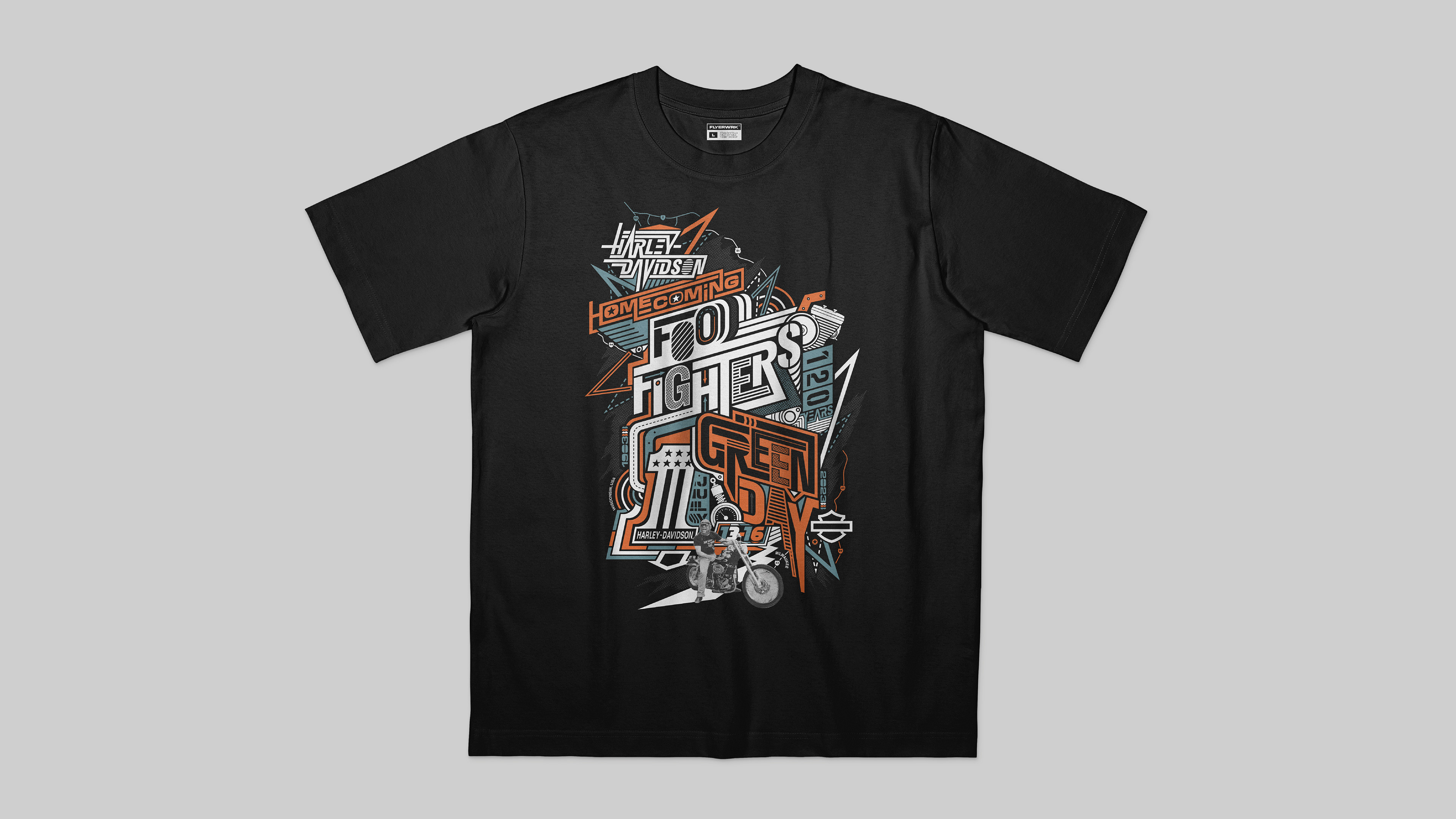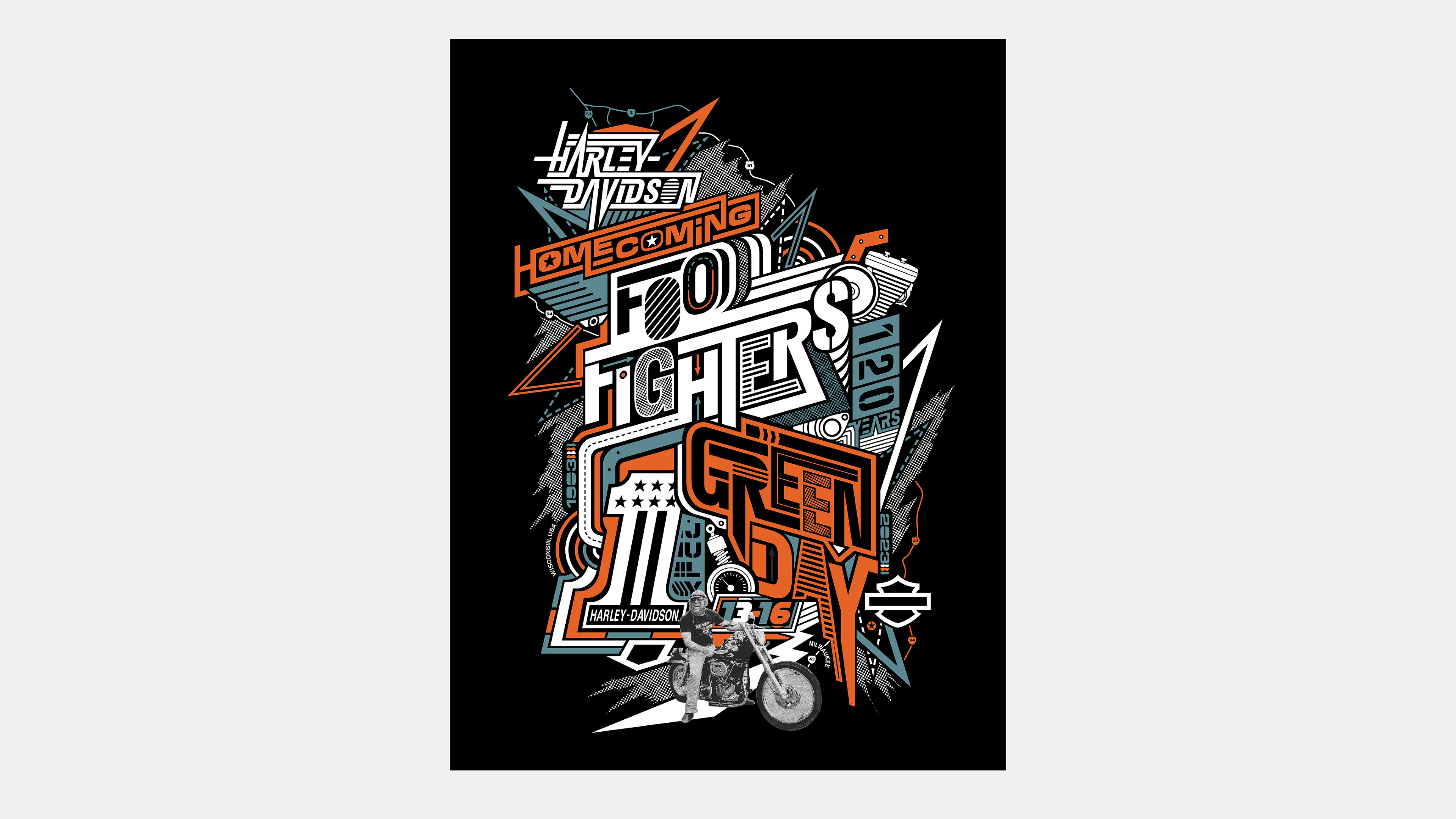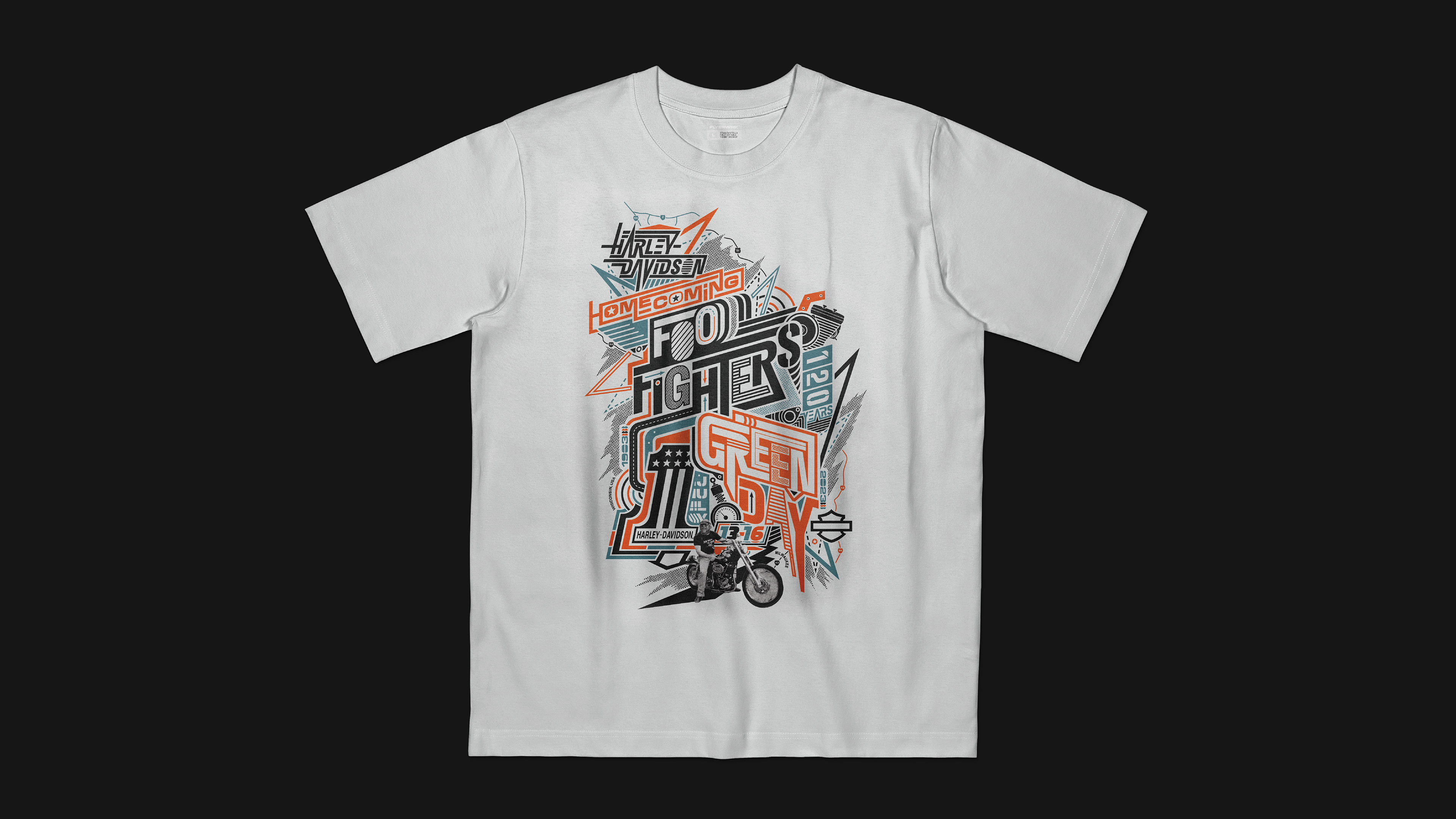 T-shirt and poster design for Harley Davidson's 120th Anniversary Homecoming concert featuring The Foo Fighters and Green Day.